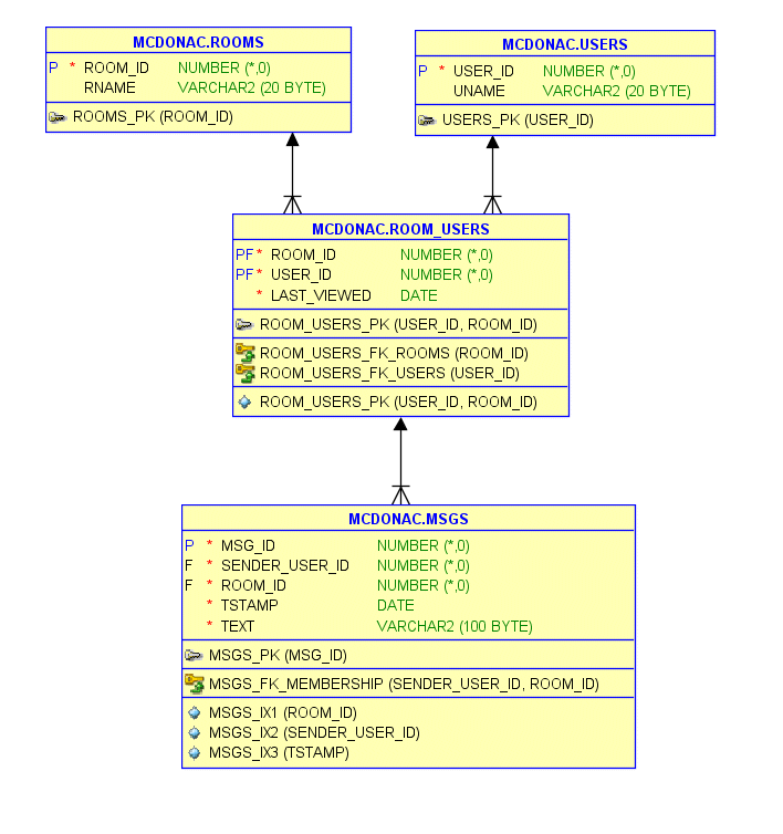 So for general queries, logging new messages etc, that’s all fine. But an additional requirement is present. When user “X” logs on to the application, they want to see how many rooms that they subscribe to have unread messages, where “unread” is defined as: there is a message in the MSGS table for that room with a timestamp more recent than the LAST_VIEWED timestamp for that user/room combination in ROOM_USERS.