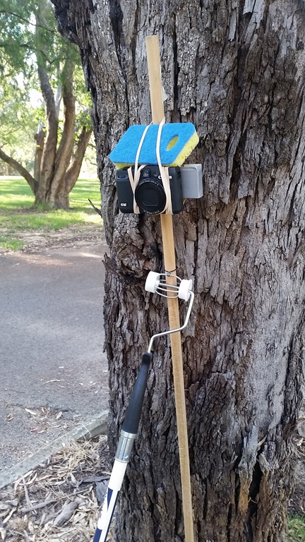- wind suppression device – yes, that’s the kitchen sponge sitting over the camera microphone slots