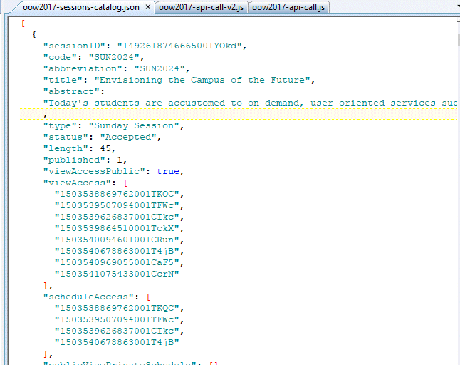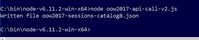 Then I stumbled upon this blog post by my friend Lucas Jellema from AMIS, where he had encountered the same issue. Lucas is much more fluent with dealing with web site content than I, and described using node as a means of pseudo-automatically driving the site via API’s. If you haven’t read the post, please do – it’s a cracking good read. Lucas’s script could grab the session catalog detail and store it as a JSON file on a local drive.