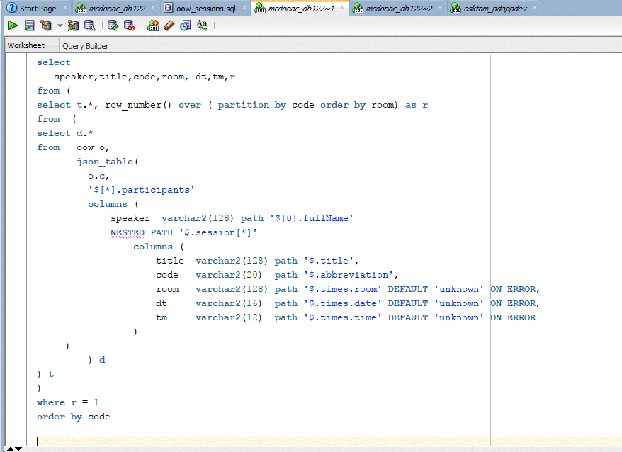At that point it was time to head into SQL Developer so that I could do some query experimentation with the JSON_TABLE clause to convert my JSON structure into a simple report. This took a few iterations because the session catalog JSON contains a lot of cross-references, presumably make the site navigation simpler. So speakers had their sessions as “children”, but also sessions had speakers as children, and of course some sessions are actually hands-on labs which repeat over a number of days etc. But ultimately, I managed to get the majority of what I needed with a little bit of JSON_TABLE and Analytic functions to weed out duplicates.