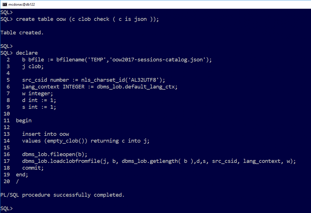 I figured I should now be able to break out the sed, awk as per normal, write up a fresh set of parsing scripts and convert the JSON into a nice simple report for myself. And that it dawned on me. I’d spent a good chunk of time this and last year at events talking about all the cool JSON facilities in Oracle 12c, so surely it would make a lot more sense to load that JSON into my database, aka “Eat my own dog food” as the expression goes. And that was remarkably simple to do. I just created a table with a single CLOB to hold the JSON, and loaded it from the file with some PL/SQL.