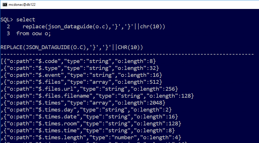 Now that it was loaded into the database, I didn’t have to worry about manually examining the JSON to work out it’s structure (because this was a 400,000 line JSON document over 7 megabytes in size!). I just threw the JSON_DATAGUIDE at it to give me a report on what the JSON structure looked like.
