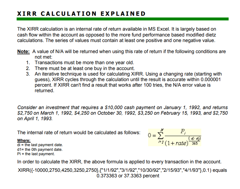 The formula with some cool mathematical symbols on the page looks like an algorithm but it is not – the real nuts and bolts is in bullet point “3”. There is no “formula” as such for XIRR – we need an iterative approach, namely, try an initial set of conditions that yields an answer “close” to the desired result, but if not, iterate continuously using previous results to slowly “narrow in” on the result until we meet some nominated tolerance value. This was starting to sound complicated ![]()