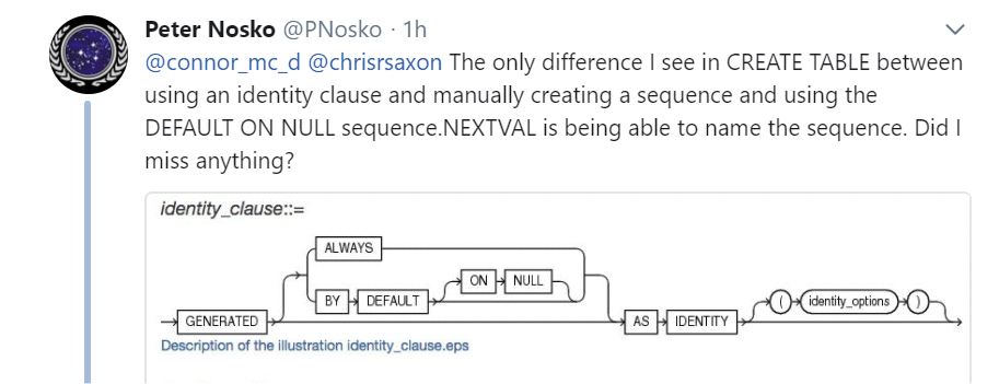 So Peter’s question was – why not just do what we’ve always done and create a sequence and assign it as the default. And yes, there is nothing wrong with doing that – it will work just fine. But there are a couple of subtle differences between that and using the IDENTITY syntax.