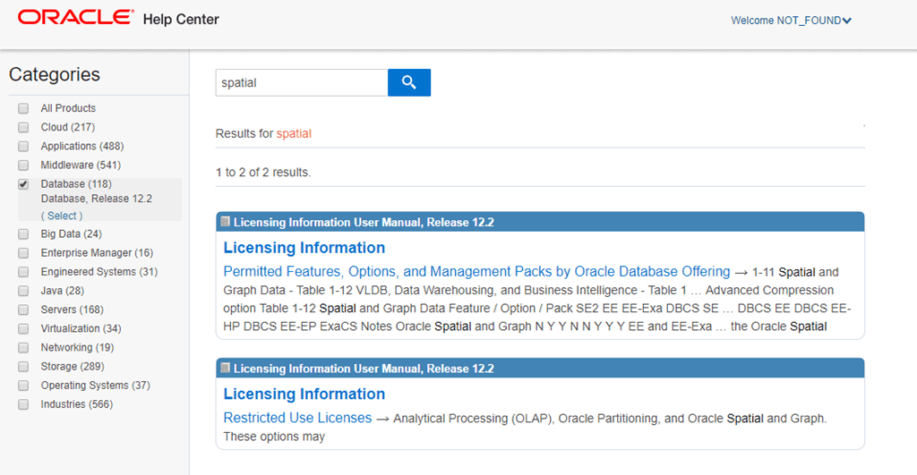 Occasionally when doing a search, the results are not limited as per my criteria. For example, if I am searching for information about Spatial in the Licensing Guide: