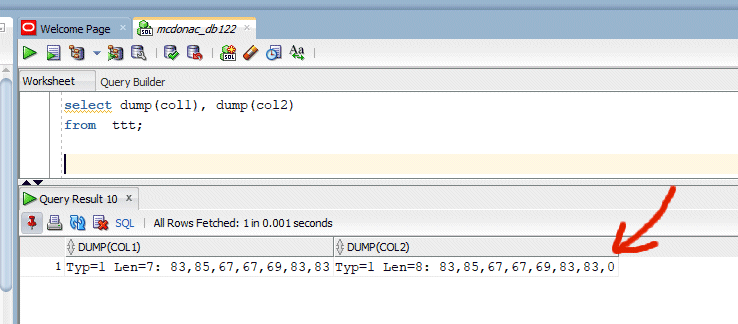 and the problem is revealed. The second column in the table had a trailing ASCII code zero after the word SUCCESS. This can be a nasty (and common) issue when developers are using C or similar languages to store data in an Oracle database. In many languages, ASCII zero is used to terminate an arbitrary length string, and hence it can easily end up being incorrectly stored along with the string bytes in a VARCHAR2 column especially if you are not using the delivered string handling functions in the pre-compiler layer (such as Pro*C). This can also be due to a confusion between the concept of NULL (two L’s) in the database, and the concept of the NUL (one L) character in a programming language.
