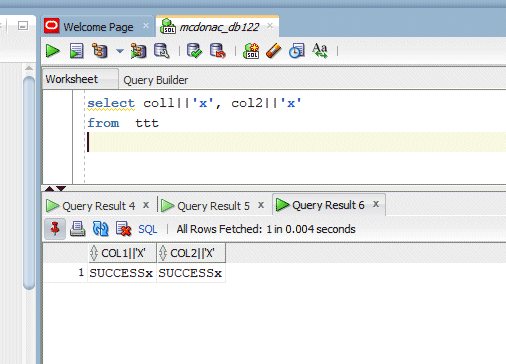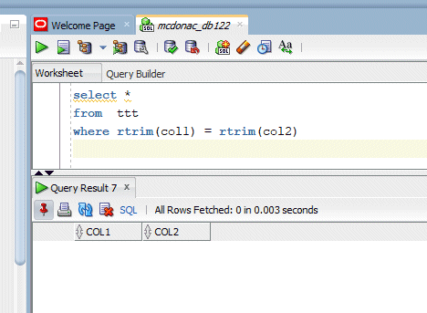 and the problem is revealed. The second column in the table had a trailing ASCII code zero after the word SUCCESS. This can be a nasty (and common) issue when developers are using C or similar languages to store data in an Oracle database. In many languages, ASCII zero is used to terminate an arbitrary length string, and hence it can easily end up being incorrectly stored along with the string bytes in a VARCHAR2 column especially if you are not using the delivered string handling functions in the pre-compiler layer (such as Pro*C). This can also be due to a confusion between the concept of NULL (two L’s) in the database, and the concept of the NUL (one L) character in a programming language.