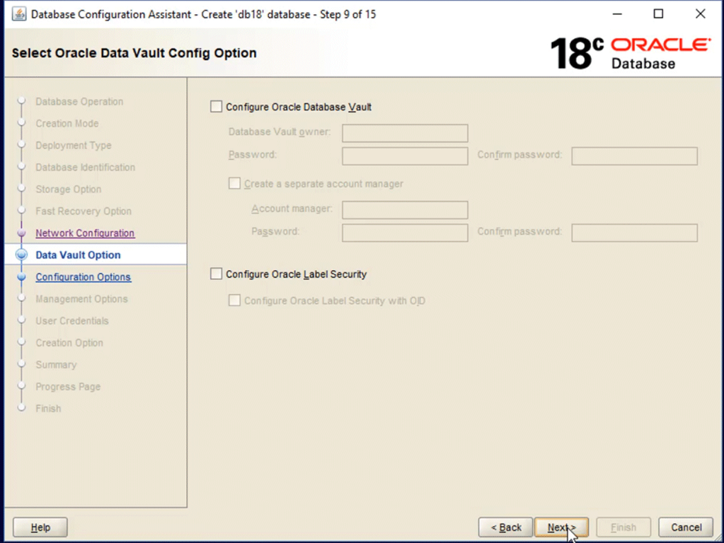 I’m skipping Data Vault and Label Security, but hopefully you can now see why it’s cool to go with the “Advanced Configuration” – you get to see all the potential functionality areas of the database that you might want to explore.