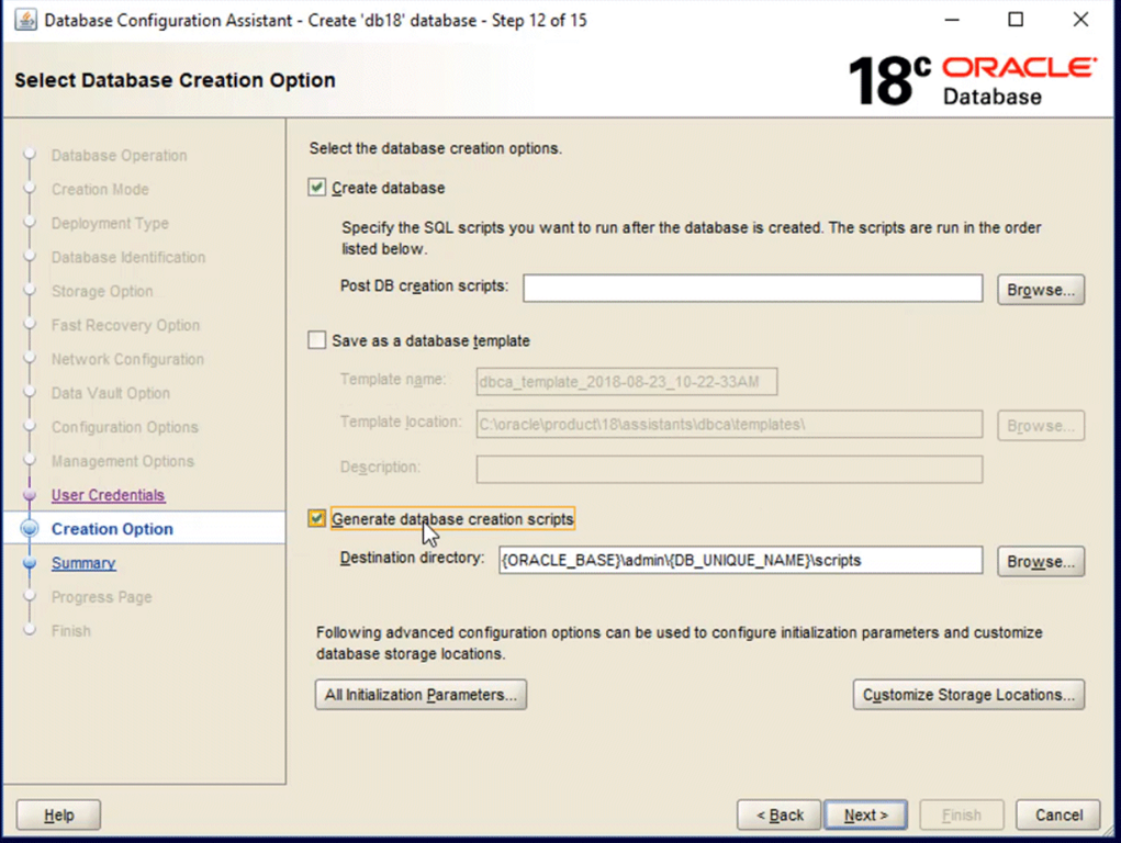 So now I’m ready to go. I always tick the “Generate Scripts” option because it lets me see what is actually occurring when the creation assistant is doing its job. Even so, the scripts are probably not what I would use to automate a database install, since the ‘dbca’ command has nice command line option nowadays, along with the ‘-silent’ option so you can create an entire database with just a single command.