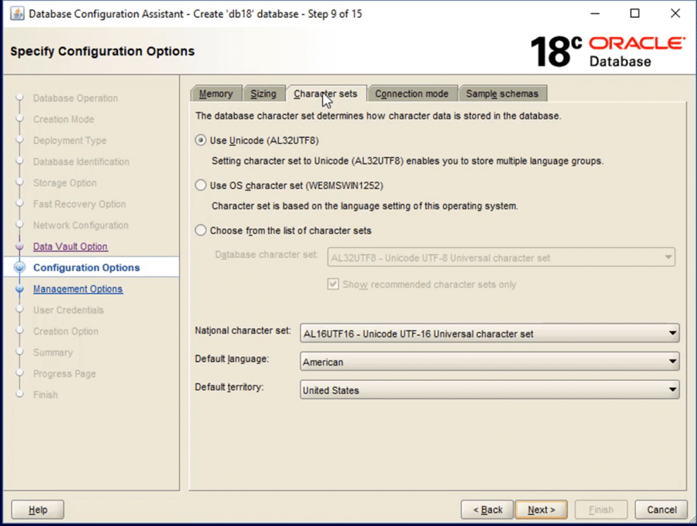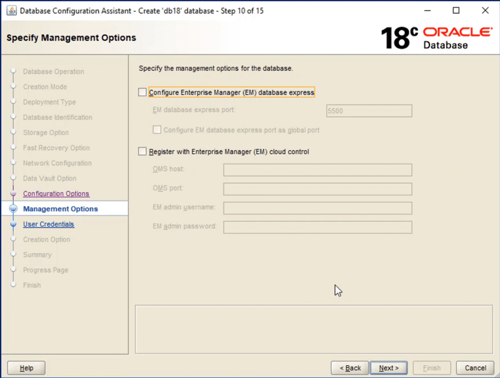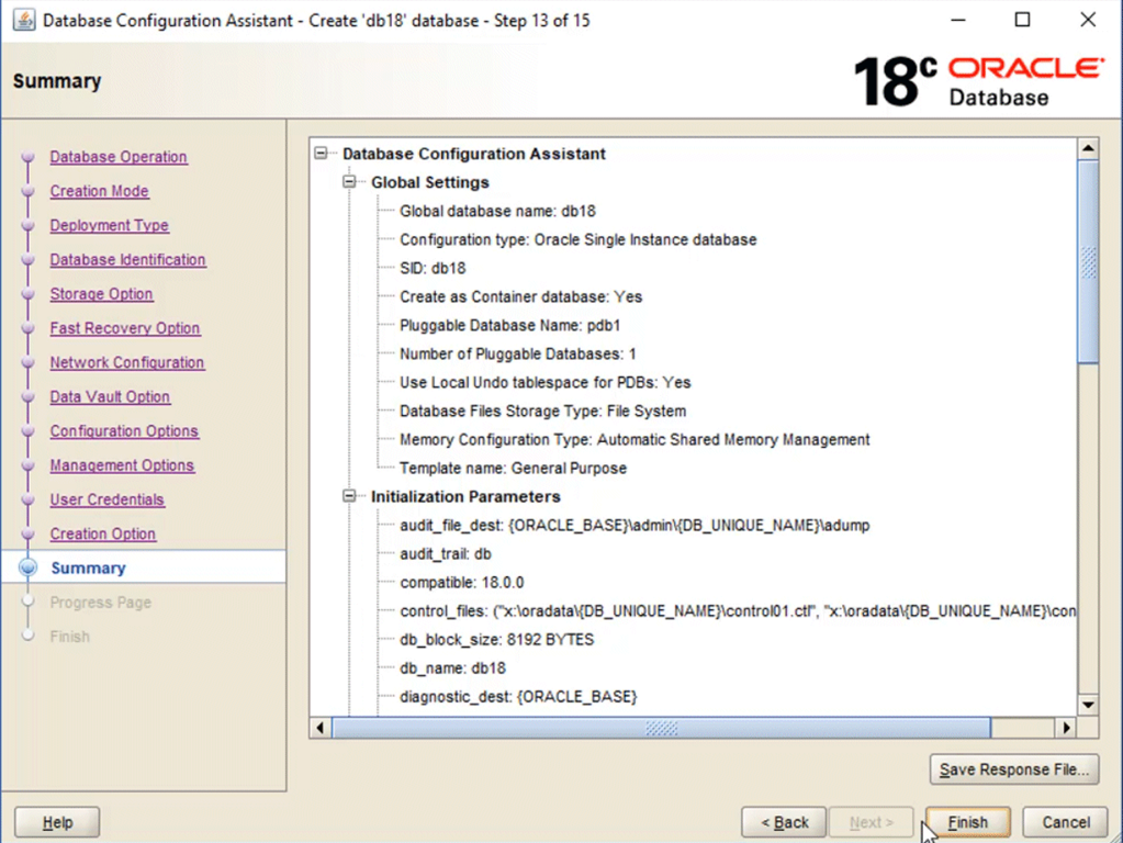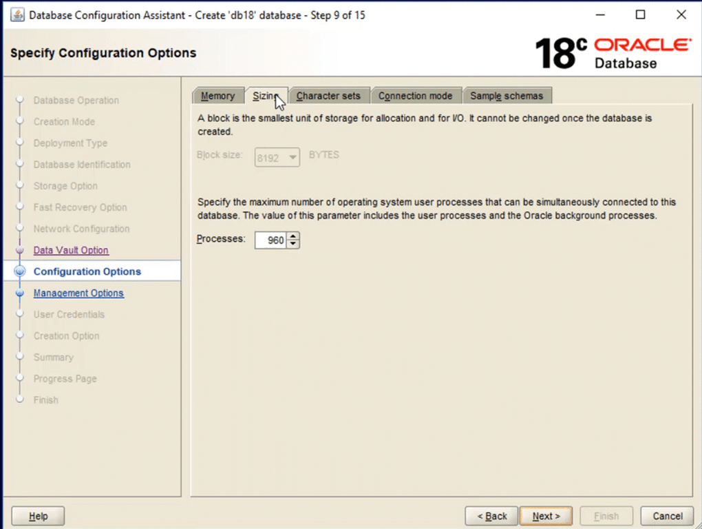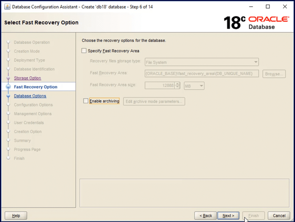 I’m skipping the fast recovery area and archiving at this stage. If I start to get serious with testing things like backup and recovery, then I would revisit this after database creation to enable at least archiving so that I can explore all the goodies that RMAN has to offer.