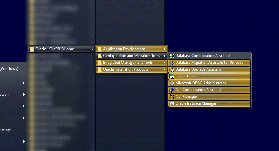 Hopefully you’ve followed my very simple and easy guide to downloading the 18c database software for Windows. But of course, software on its own is not much use – we need a database! So let’s get cracking and create one. Using the Start menu like I’ve done below, or using the Windows panels, locate the Database Configuration assistant and start it.