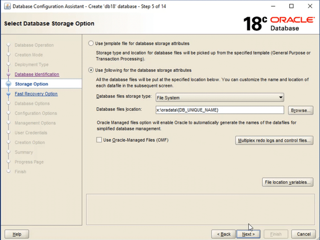 To keep things simple, I’m just nominating 1 single location for all of my database files. It can be anywhere but a common convention is that wherever you house them, you’ll have a folder called “oradata” and then a folder for each database you create under that.
