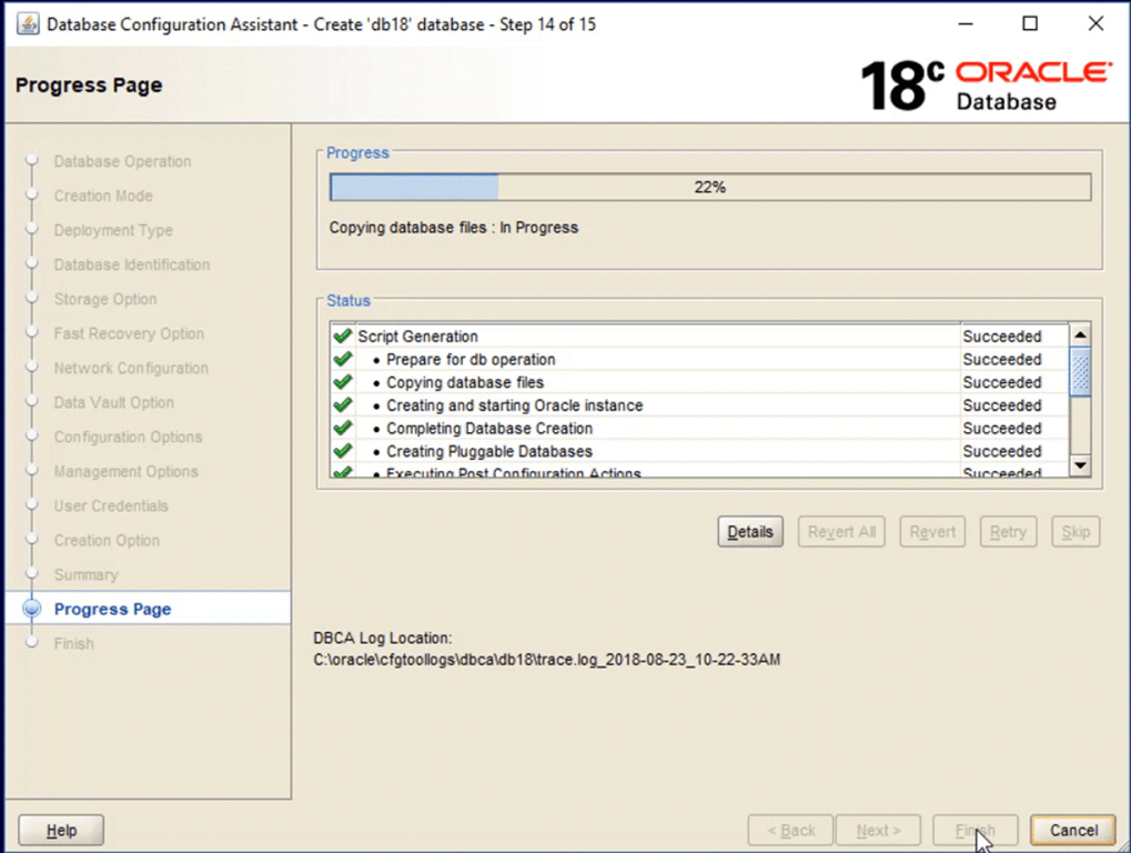 The total time to create your database will depending on your hardware, in particular how fast your storage is. I’ve done a few creations now using both flash storage and conventional hard drives, and unsurprisingly the flash storage is faster. You’re probably looking at around 10 minutes to complete.