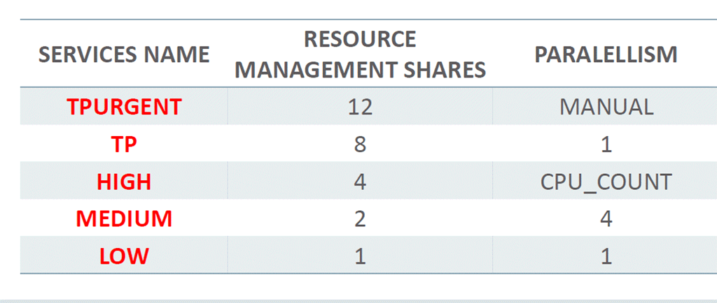 . So its important to be aware of the parallelism facilities defined for MEDIUM and HIGH. We’ll do operations in parallel whenever possible. You get faster queries and faster DML but there are implications on the way you write your scripts, the locking that will result and how commit processing must be handled. HIGH and MEDIUM are not just “bigger” versions of the LOW service.