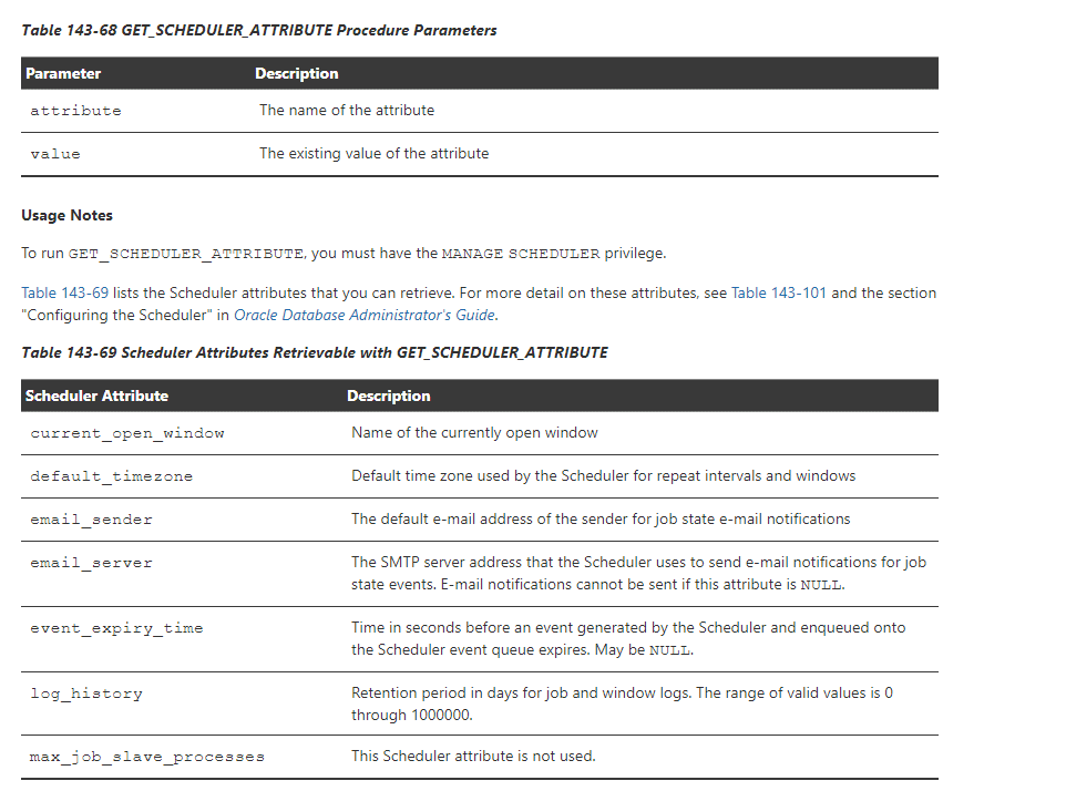 SQL> select * from DBA_SCHEDULER_GLOBAL_ATTRIBUTE;