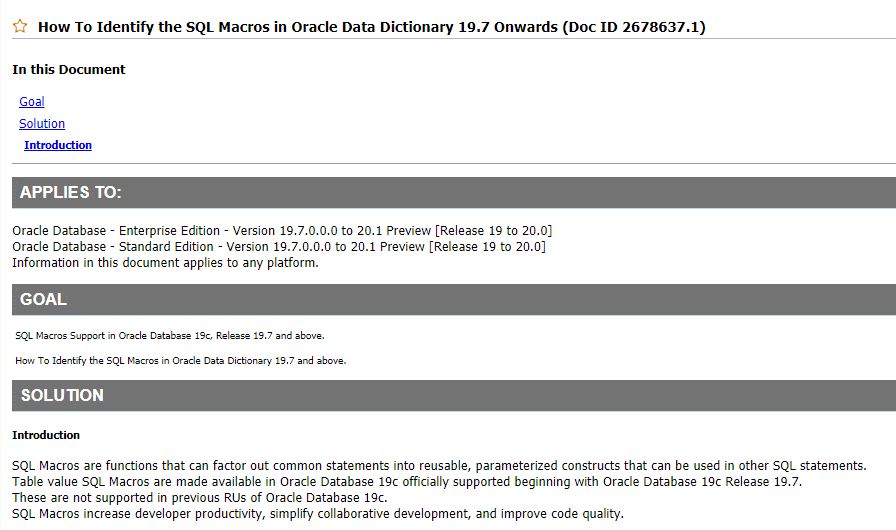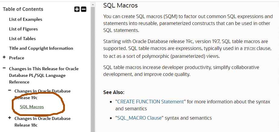 If you are looking for a great primer on SQL Macros, check out Keith Laker’s blog post on them, and as you can see, they will be available in all permutations of the database on an Release Update of 19c. They are available on Autonomous Database and LiveSQL support is also there.
