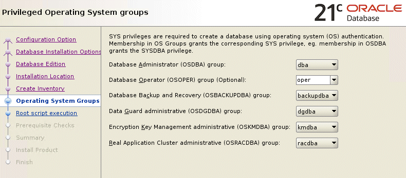 One of the tasks this rpm takes care of is creating a set of OS groups to handle various system administration roles that you might want to delegate with OS level utilities, such as backups, dataguard maintenance, RAC tasks etc. You can see these groups in /etc/group