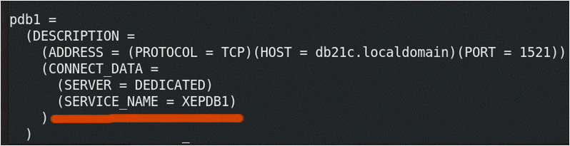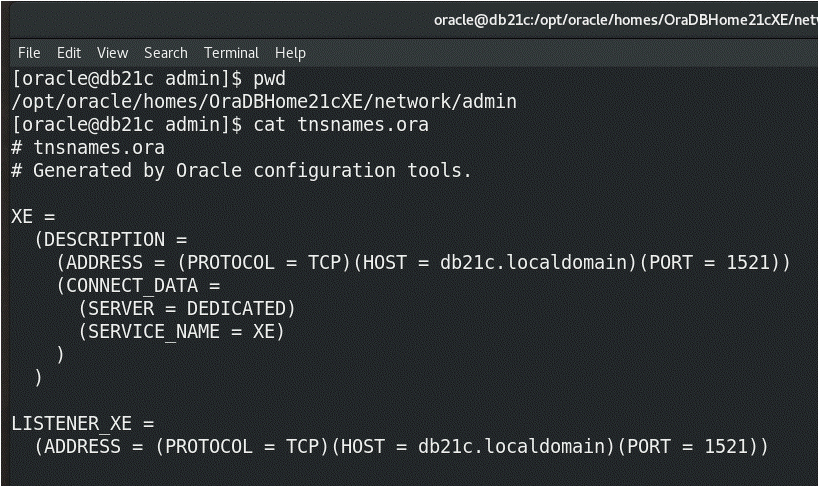 Like all editions of 21c, XE uses the read-only Oracle Home layout, so your SQL*Net configuration files will be under the “homes” folder, not under the software defined ORACLE_HOME. Once you navigate there, your tnsnames.ora file will look like this: