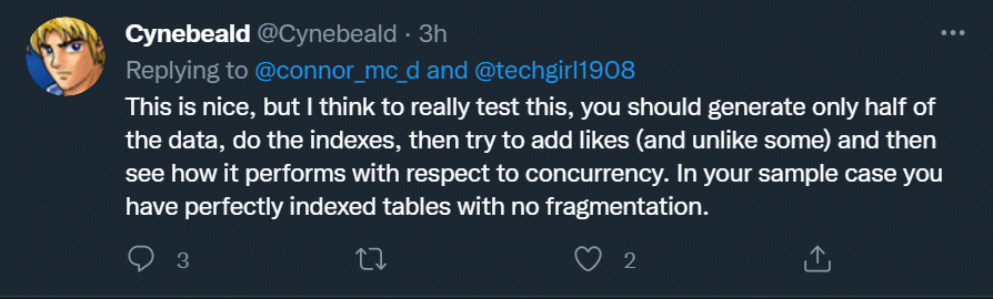 This means the indexes are nicely compacted with no “fragmentation”. This is a valid point but as I responded on Twitter, when you trying to do a weekend query test with a 2billion row table, then pre-loading the data makes a lot of sense unless you want to lose most of your weekend waiting for the table to be populated with single row inserts ![]()