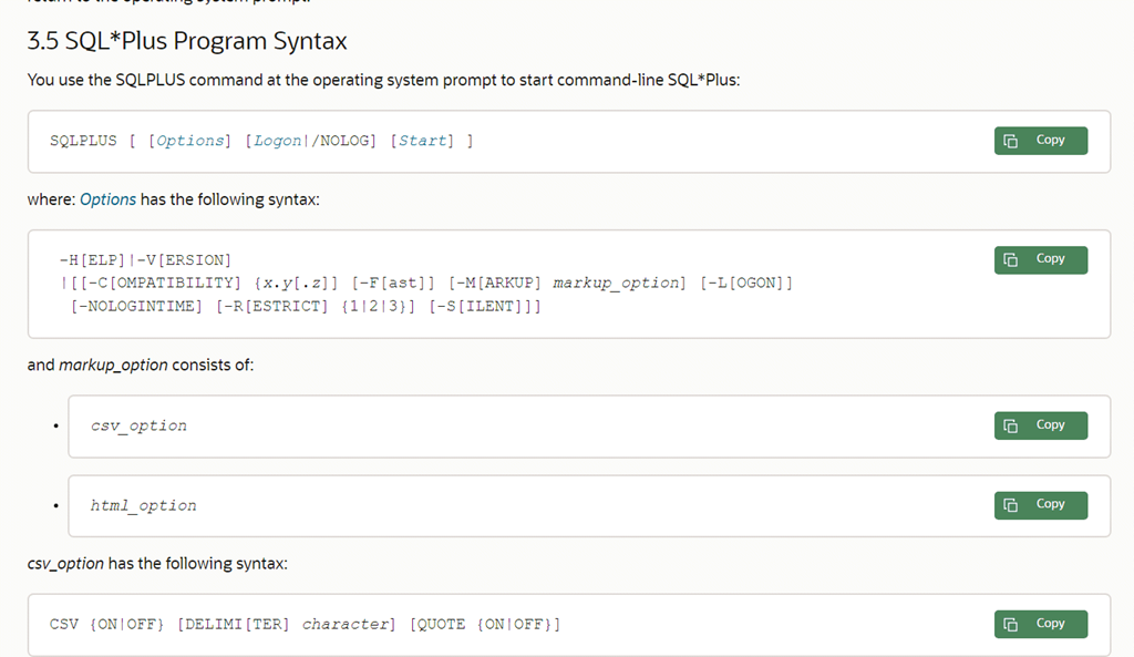 For the SQL*Plus demo, you’ll notice that I had to nominate the markup settings, and also tweaked some SQL*Plus settings a little to get the best query fetch performance. If this all seems too complicated, then here’s a shortcut for you. When you start SQL*Plus, if you know that the purpose of running this SQL*Plus session is to unload some data, you can nominate the MARKUP options right there on the command line at startup.