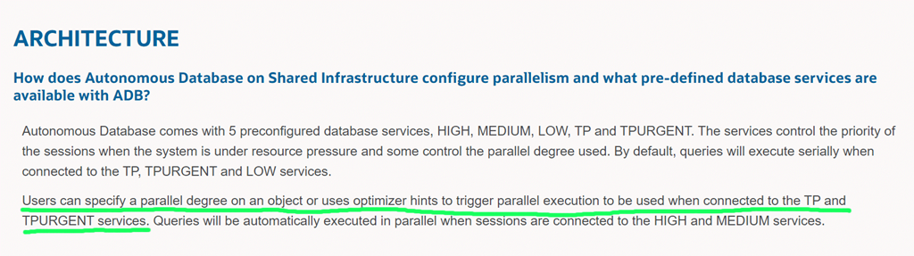 When you are using Autonomous Transaction Processing database, as well as the LOW, MEDIUM and HIGH services that are also present on the Autonomous Data Warehouse offering, there are TP and TPURGENT services that you can use. I got asked by a customer how they differ, and while TPURGENT gets a little more slice of the pie, as you can see below: