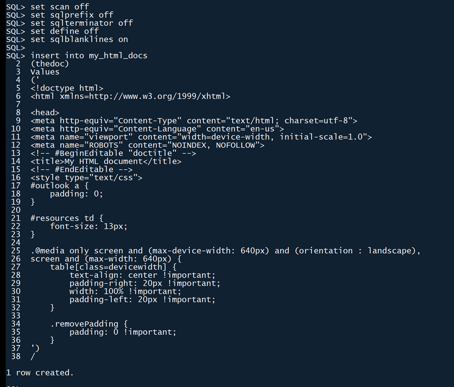 However, one small problem still remains that SQ*Plus cannot overcome. If you encounter an “@” sign as the first character on a line, then SQL*Plus is going to interpret that as a “run a script” command. Notice line 25 below: