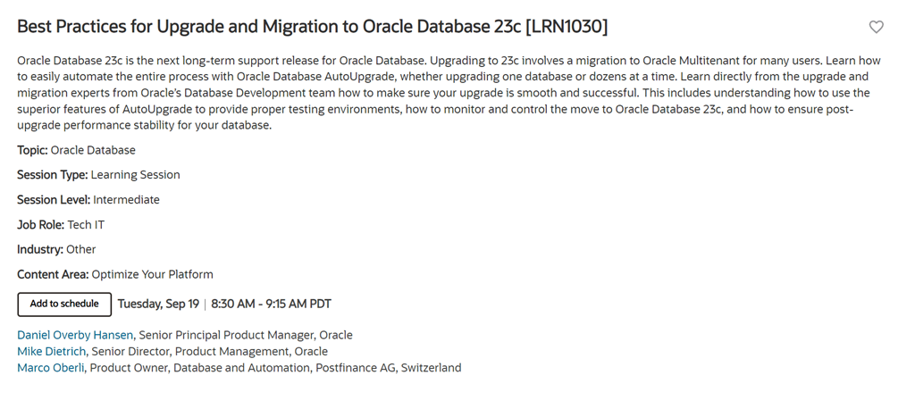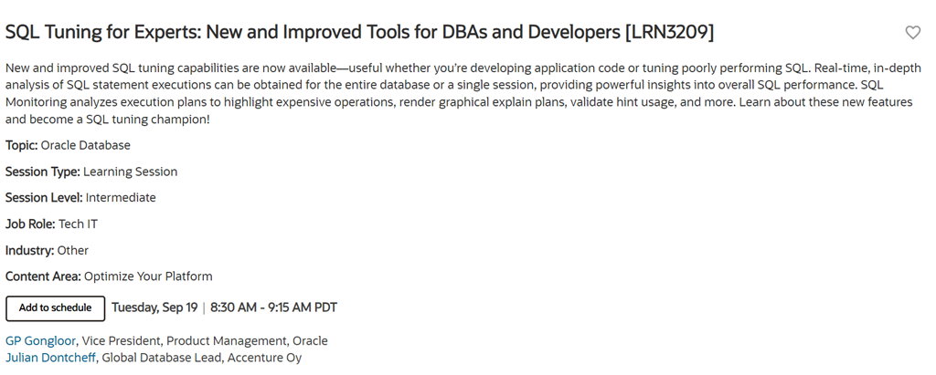 or, if you’re already up to speed with SQL tuning, then with 19c being a long term support release, and 23c also being the next long term support release, many of you will have an upgrade coming up, so check out this session to make sure you’re not going to make any mistakes.