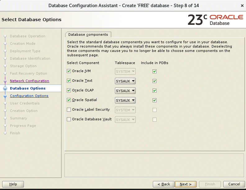 Here is where you decide on what you features you do (or do not) want in your free edition database. Each option you choose will consume a little bit of SYSAUX space, so if you are concerned about that, you can de-select options but we will be taking some steps later to ensure our SYSAUX never grows out of control anyway. So if you think you might need any of these options, I’d recommend you may as well keep them selected for now.
