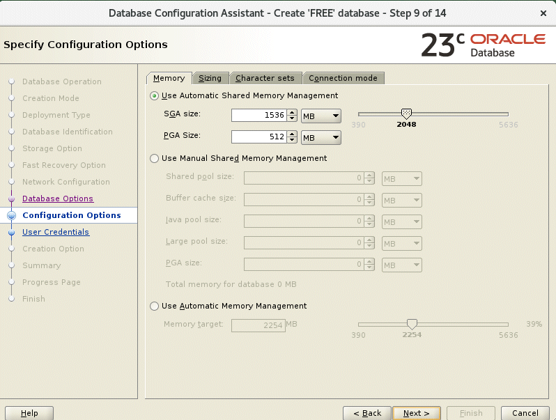The memory parameters are fixed at the limit of 2G so don’t change of those before moving to the next screens (in which you just need to go with the defaults, perhaps with the exception of archive logging if you need it).