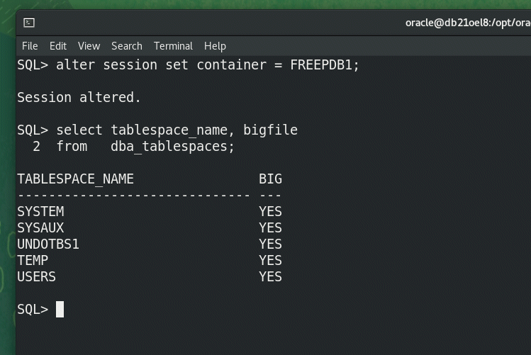 Once the creation is done, if you connect to the database in either the root container or in the PDB, you’ll see that the tablespaces are all created as BIGFILE.