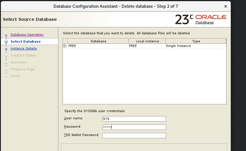 Because this is the free edition, there will only be one database to choose and it will be named FREE. Enter your SYS password and continue to accept the default prompts until your database is deleted forever!