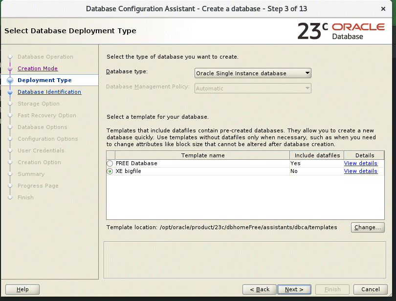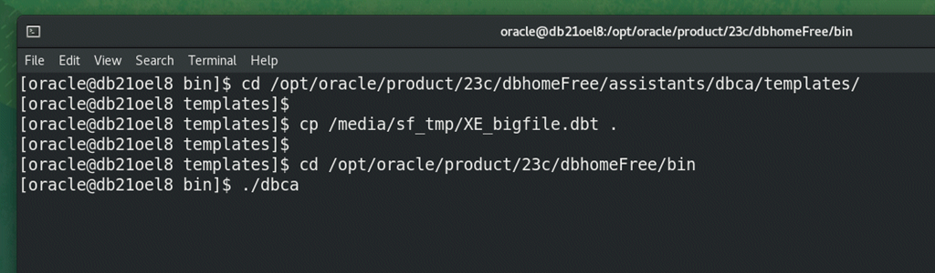 Now we are going to recreate this database, but before you do so, head over to my git repo and download the “XE_bigfile.dbt” template file. Transfer that file to your database host and copy it into the $ORACLE_HOME/assistants/dbca/templates folder like below. We are going to use that template to build a new version of the free database. Then fire up “dbca” again from $ORACLE_HOME/bin.