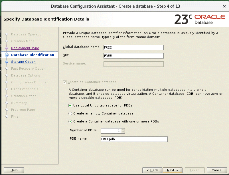 Even though the next screen prompts us for the database name, the only name allowed for the database free edition is FREE, so don’t change anything here and move to the next screen.