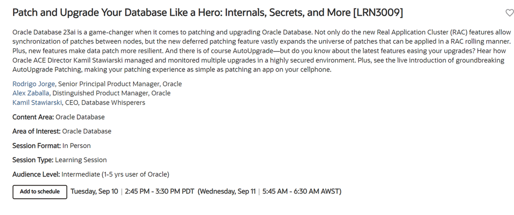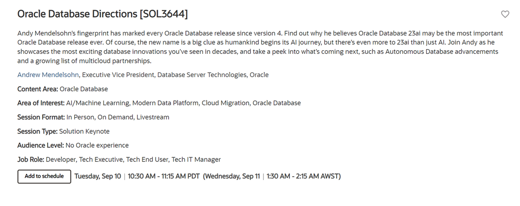 If keynotes are not your thing, this might be a good time to sneak into the 23ai hands on lab, or if grab a theatre session with Doug Hood who looks after much of our AI vector offerings in the Oracle Database.