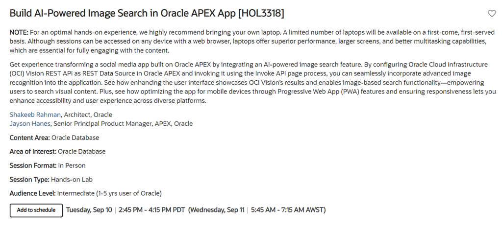 After lunch, for the DBAs there’s a great session on patching with good friend Kamil, but if APEX is more your thing, then it’s hard to go past a Hands On Lab session that has Shakeeb on hand to assist.