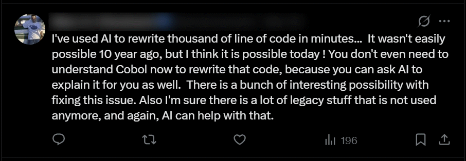 Now, to bring this discussion back to the original Bluesky post at the top of this blog, I invite you to apply that challenge to a trillion dollar system that pays millions of people, where perhaps a single incorrect or missing unit test in your new system yields a situation where payments are wrong or missing, the consequences of which could be people not being able to pay rent, or buy food for their family, or a myriad of other personal hardships.